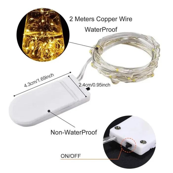 – le luci del filo di rame sono impermeabili, il che significa che può essere utilizzato all’aperto o sott’acqua, ma per favore non mettere il tappo con le batterie nell’acqua.Al fine di evitare un’esplosione, please do not throw the battery into the fire.
