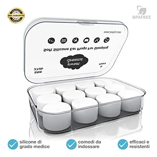 • ✅ EFFICACI : I Tappi per orecchie per dormire IORLYS sono morbidi e in soft silicone resistente, confortevoli, massima riduzione decibel SNR 27 db dei rumori esterni, cani che abbaiano, cantiere in costruzione, hotel , strade trafficate , isolano il rumore del russamento dovuto ad apnee notturne. Con i nostri tappi per orecchie antirumore riscopri subito il piacere di dormire. In OMAGGIO per te una custodia porta tappi orecchie da viaggio utile per mantenere divisi quelli puliti da quelli usati