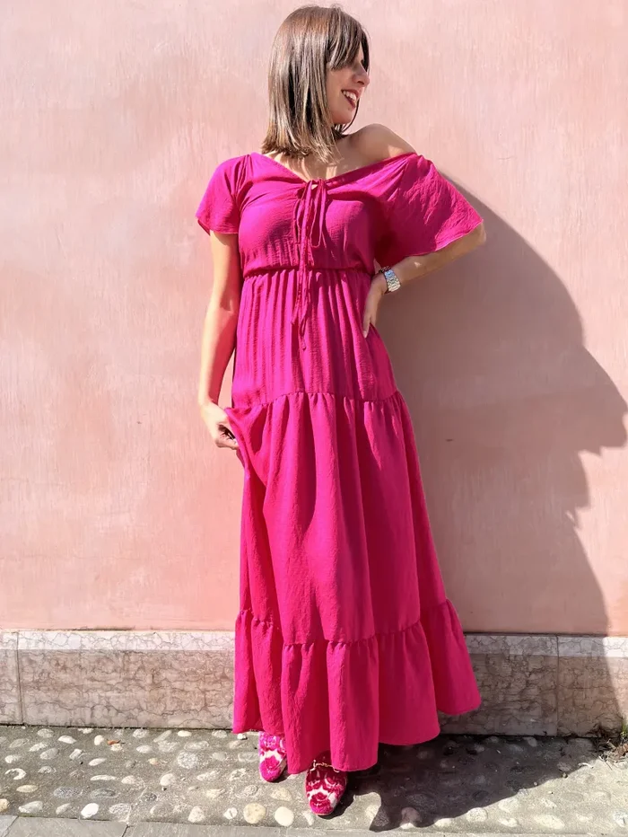 Aggiungi un tocco di stile alla tua collezione di abbigliamento con questo abito lungo con balze! Realizzato in morbida viscosa con maniche con volant e elastico in vita, offre un look elegante e confortevole per ogni occasione. Fai la differenza e ispira con questo capo di alta qualità!