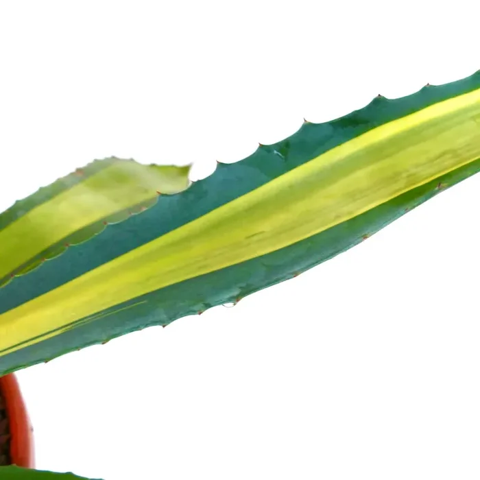 Aspetto: L’Agave americana ‘Mediopicta Yellow Variegation’ è una pianta succulenta di dimensioni medio-grandi che forma tipicamente una rosetta di foglie spesse e carnose. Ciò che distingue questa cultivar è la sua sorprendente variegatura, che consiste in strisce dal giallo al bianco crema che corrono lungo la lunghezza di ciascuna foglia. La variegatura contrasta magnificamente con il colore di sfondo verde delle foglie, creando uno spettacolo accattivante e accattivante.