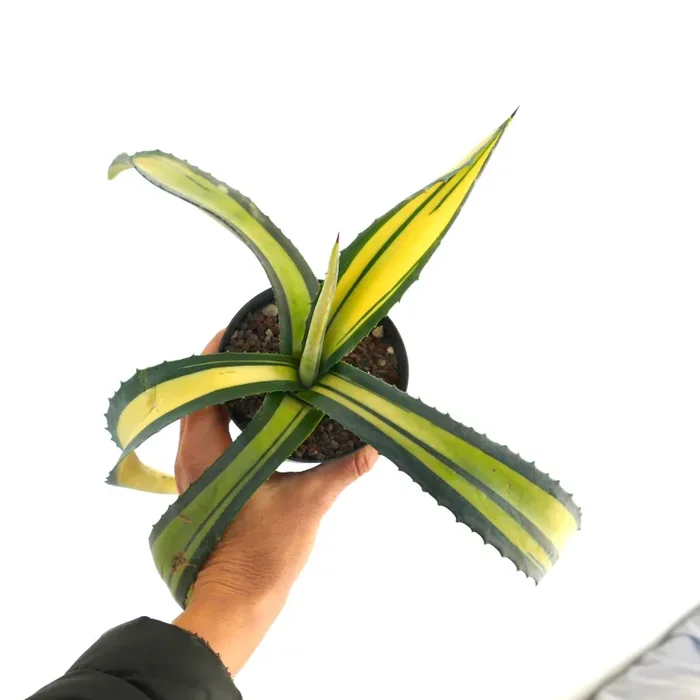 Aspetto: L’Agave americana ‘Mediopicta Yellow Variegation’ è una pianta succulenta di dimensioni medio-grandi che forma tipicamente una rosetta di foglie spesse e carnose. Ciò che distingue questa cultivar è la sua sorprendente variegatura, che consiste in strisce dal giallo al bianco crema che corrono lungo la lunghezza di ciascuna foglia. La variegatura contrasta magnificamente con il colore di sfondo verde delle foglie, creando uno spettacolo accattivante e accattivante.