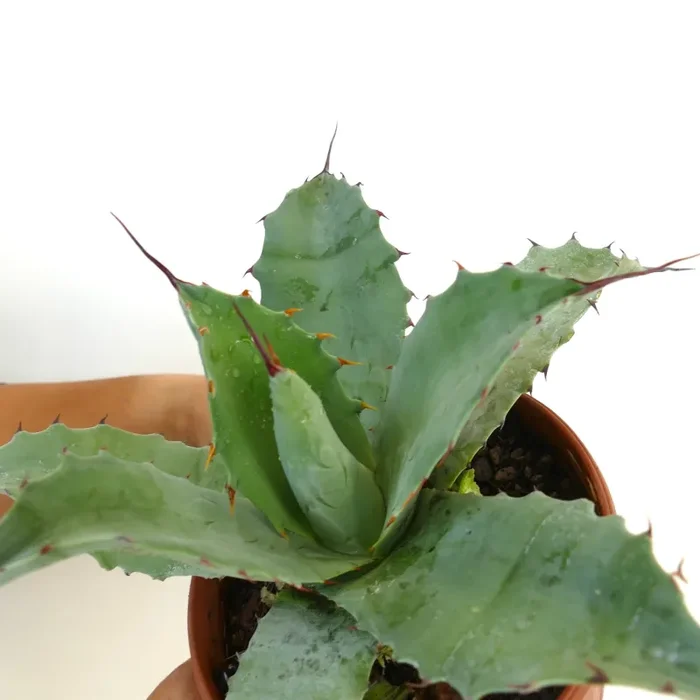 L’ibrido Agave salmiana × Agave ovatifolia × Agave parrasana è una succulenta rara e robusta che unisce le foglie ampie e decise di Agave salmiana, le tonalità lisce e argentee di Agave ovatifolia e la simmetria compatta di Agave parrasana. Questo ibrido forma una rosetta densa con foglie spesse blu-verdi, appuntite a una forte spina terminale e con sottili denti marginali. La sua struttura imponente e architettonica lo rende protagonista in ogni paesaggio arido, offrendo resistenza e bellezza.