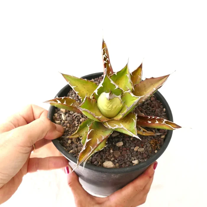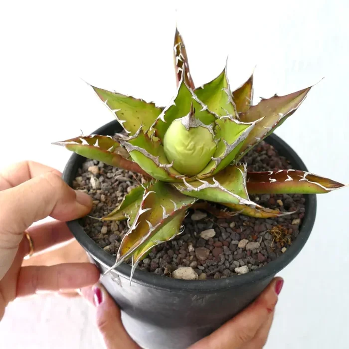 Agave titanota è una splendida succulenta nota per la sua rosetta compatta e simmetrica di foglie larghe e spesse. Le foglie sono verde-bluastro con una sfumatura di grigio, bordate da denti affilati che conferiscono alla pianta un aspetto feroce ma bellissimo. I margini delle foglie sono tipicamente bianchi o chiari, aggiungendo un contrasto sorprendente alla superficie più scura della foglia. Questo agave può crescere fino a 60 cm di diametro, diventando un elemento di spicco in qualsiasi giardino o contenitore. Le piante mature possono produrre un alto stelo fiorito con grappoli di piccoli fiori giallo crema.