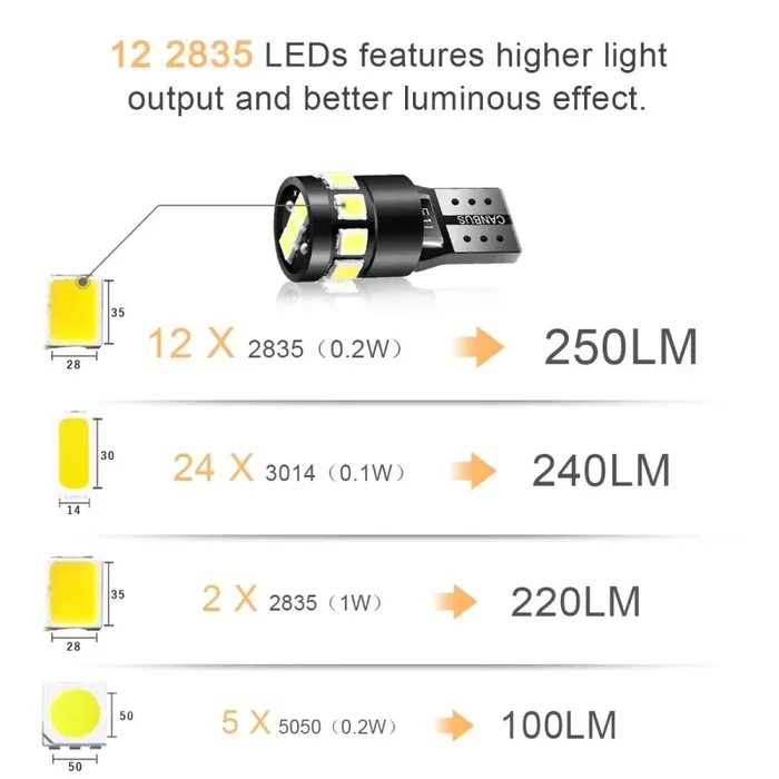 Ogni lampadina ha 12 SMD 2835 in essa, meno perle di lampada con maggiore luminosità, angolo di illuminazione di 360 gradi, nessun punto cieco, super luminoso porta alla tua auto un nuovo aspetto rinnovato.