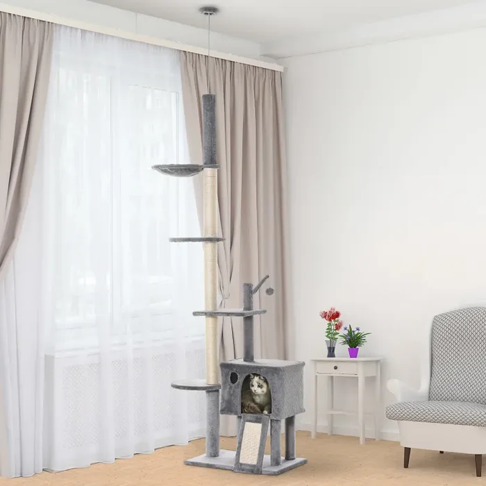 - Puoi fissare l’albero per gatti al soffitto con il palo regolabile