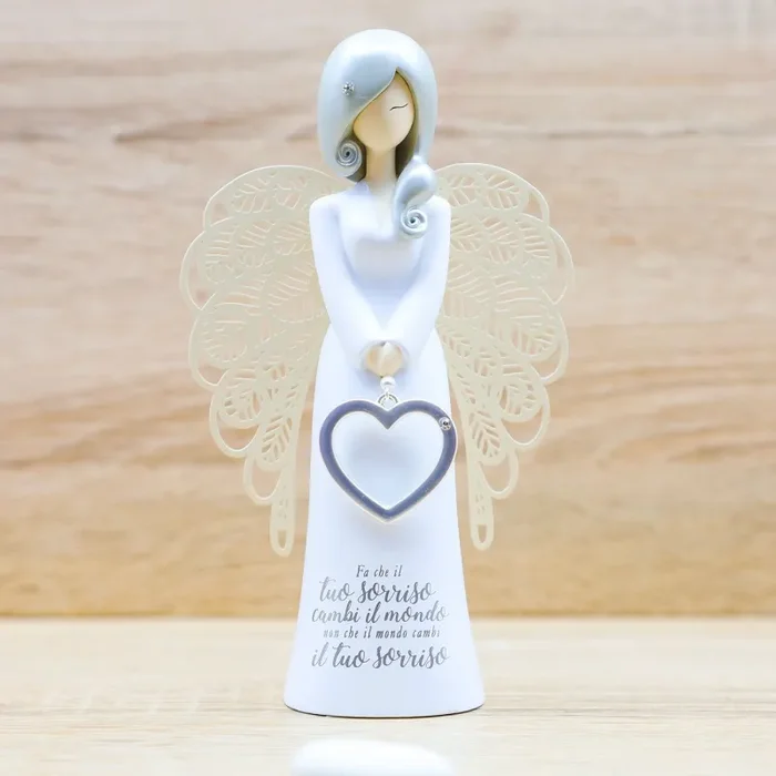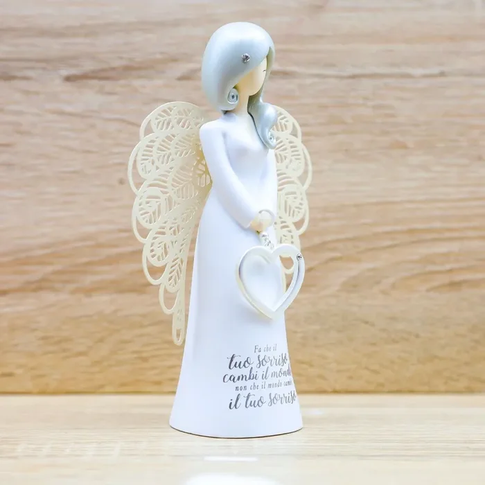 Questo angelo ha ali di metallo verniciato a polvere bianca, un ciondolo a forma di cuore di metallo e la frase “Fa che il tuo sorriso cambi il mondo non che il mondo cambi il tuo sorriso” inciso sul vestito. Ogni angelo è confezionato in una bellissima confezione regalo progettata con dettagli in lamina d’oro. Perfetto come regalo e decorazione della casa.