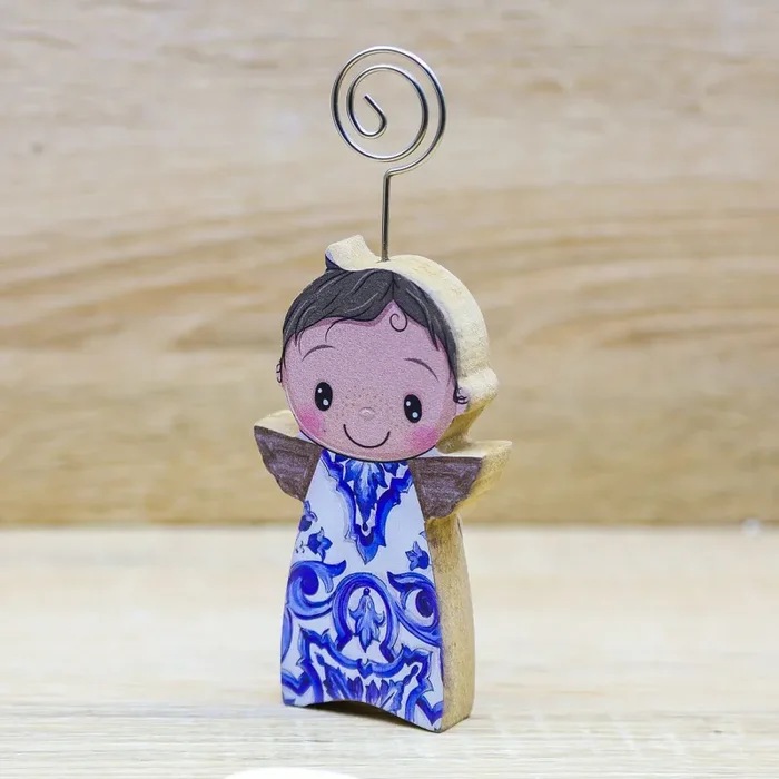 Angelo con decori vieteresi blu sull’abito e clip portafoto, firmato Cuore Matto.