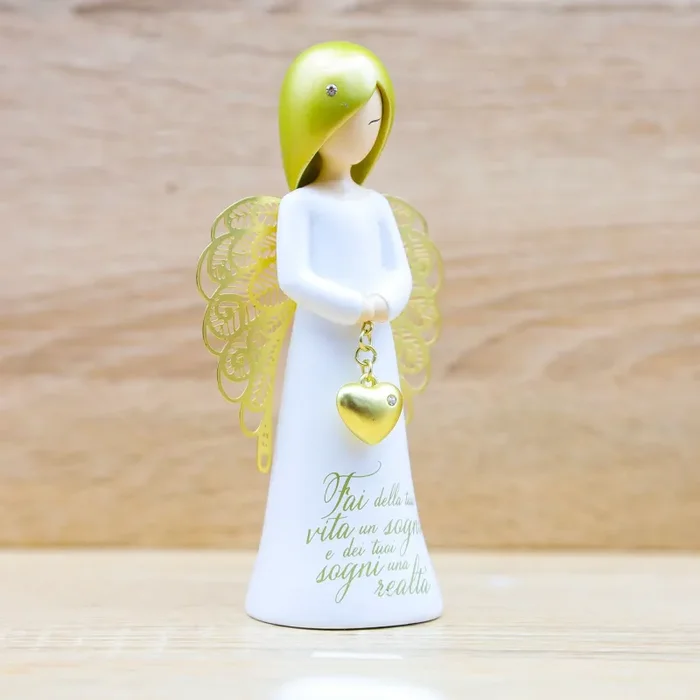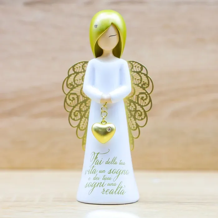 Questo angelo ha ali di metallo dorato, un ciondolo a forma di cuore e la frase “Fai della tua vita un sogno e dei tuoi sogni una realtà” è incisa sul suo vestito. Ogni angelo è confezionato in una bellissima confezione regalo progettata con dettagli in lamina d’oro. Perfetto come regalo e decorazione della casa.