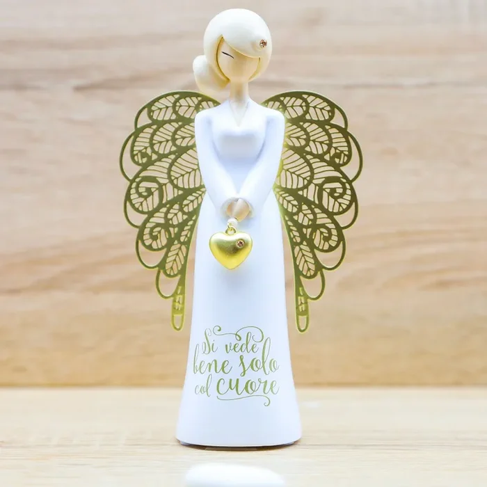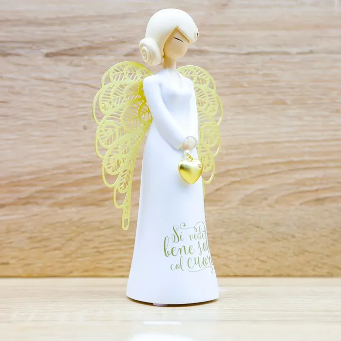 Questo angelo ha ali di metallo dorato, un ciondolo di metallo a forma di cuore e sul suo vestito è incisa la frase “Si vede bene solo col cuore”. Ogni angelo è confezionato in una bellissima confezione regalo progettata con dettagli in lamina d’oro. Perfetto come regalo e decorazione della casa.