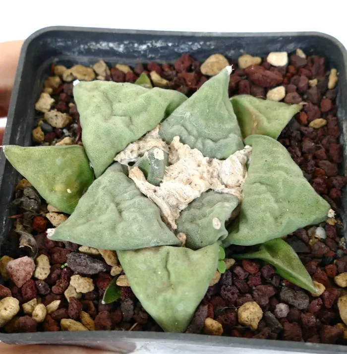 Ariocarpus retusus ‘Green Star’ è un cactus straordinario e a crescita lenta originario del Messico. Presenta una rosetta di tubercoli spessi, triangolari e verde scuro, quasi senza spine. I tubercoli possono crescere fino a 5 cm di lunghezza, creando un motivo a stella. Questa forma è particolarmente nota per il suo colore verde brillante. Produce grandi fiori a imbuto bianchi o rosa in autunno, che contrastano magnificamente con il fogliame verde scuro. Questo cactus prospera in ambienti aridi e rocciosi con suoli ricchi di calcare, rendendolo un favorito tra i collezionisti di cactus.