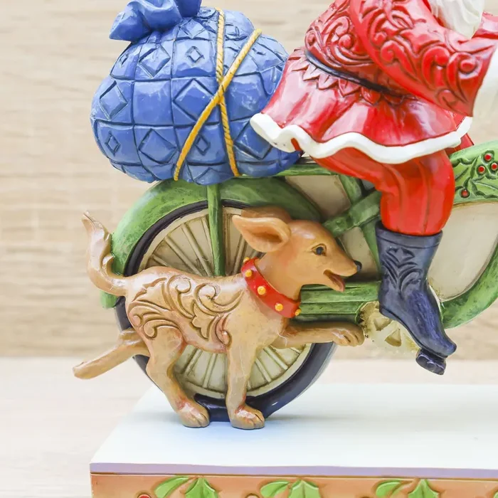 Statuina di Babbo Natale in sella ad una biciclette con il sacco pieno di regali e in compagnia di un cagnolino, firmato Enesco.