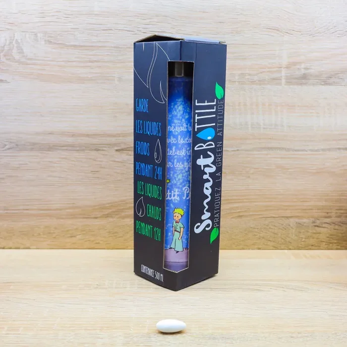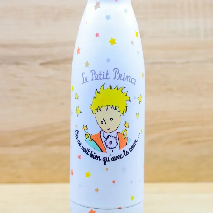 Bomboniera Utile, bottiglia termica con decoro del Piccolo Principe con la celebre citazione “Si vede bene solo con il cuore, l’essenziale è invisibile agli occhi”. Dai disegni originali di Antoine de Saint-Exupery. Prodotto su licenza ufficiale del Piccolo Principe.