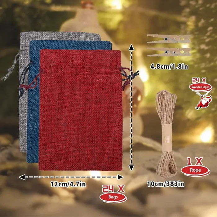- 【18 x 13 cm 24 calendari dell’Avvento da riempire Grande 2024】 Questo simpatico set di sacchetti è perfetto per realizzare un calendario dell’Avvento! Contiene 24 sacchetti di stoffa (in rosso, blu e grigio), ogni sacchetto misura 13 x 18 cm. Il set contiene anche 24 fermagli di legno, 24 adesivi con motivi natalizi e un cordoncino di juta lungo 10 metri. Create per i vostri cari un calendario dell’Avvento speciale!