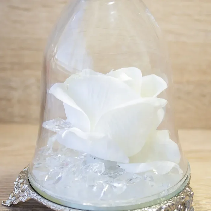 Campana Led con all’interno base in specchio, una Rosa in tessuto Bianca su petali di cristallo. Piedini in Metallo bagnato argento.