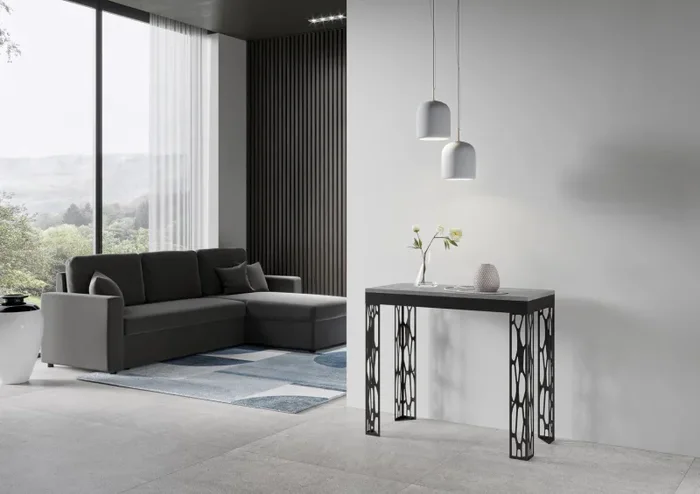 Consolle Ghibli. La Consolle Ghibli ha delle gambe che non le consentono di passare inosservata. Gambe in ferro verniciate, leggere e resistenti allo stesso tempo, con la loro sagoma traforata, permettono di dare un tocco di leggerezza atutta la struttura. Perfetta per ogni ambiente e fondamentale per chi cerca la comodità di un tavolo allungabile pur avendo a disposizione uno spazio estremamente limitato. Inseribile in contesti classici e moderni. In poche e semplici mosse, la Consolle Ghibli si trasforma in un tavolo da pranzo abbastanza grande da ospitare comodamente 14 commensali. La Consolle Ghibli può essere allungata con tre allunghe per raggiungere la lunghezza massima di 300 cm. Un mobile di pregio a un prezzo imbattibile. Realizzata interamente in Italia mediante l’utilizzo di materiali 100% italiani. Composta essenzialmente da due parti: struttura portante in metallo verniciato, piano superiore allungabile con sistema di guide in alluminio ad elevata scorrevolezza.