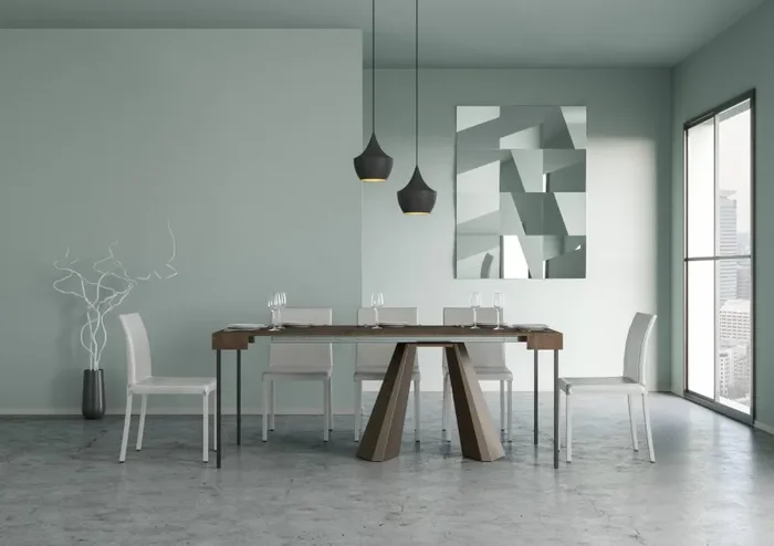 Consolle Diamante, un Tavolo Consolle ricercato per arredare con gusto e design la tua casa. La linea originale rende la Consolle perfettamente adattabile al mobilio di casa, che sia in stile classico o moderno.Ciò che contraddistingue la Consolle Diamante è la praticità con la quale sarà possibile trasformarla da semplice e lineare Consolle a comodo e utile tavolo da pranzo.La Consolle Diamante potrete collocarla in cucina, in sala da pranzo o in soggiorno, potrà essere interessante come punto di appoggio non appena si entra in casa se posta in ingresso e perché no, con sopra uno specchio e vicino a un vaso di fiori.La funzionalità e la versatilità la si riscontra proprio nella possibilità di allungare Consolle Diamante per ospitare fino a 14 amici e parenti nei momenti più importanti da condividere.Con il sistema di allunghe, in poche e semplici mosse trasformerete la piccola Consolle in un ampio tavolo da pranzo: stabile, resistente e robusto. La solidità della struttura il ferro con il piano lavorato a Folding, rende la Consolle robusta e stabile. Interamente made in Italy La Consolle di serie viene fornita con un sostegno centrale a due appoggiaterra che ne garantisce la propria funzionalità.