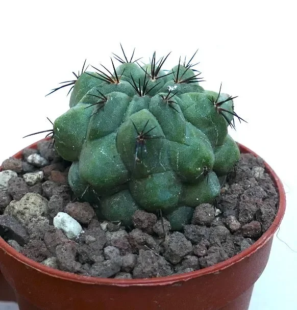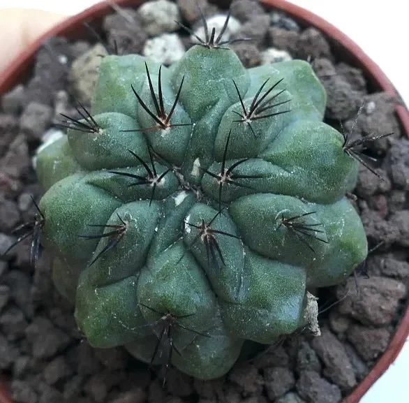 Descrizione: Questo ibrido combina tratti di entrambe le specie. Copiapoa cinerea ‘Kikko Green’ ha una pelle verde e strutturata con creste rialzate, simile a una pallina da golf, da cui il nome “Kikko”. Copiapoa hypogaea ha fusti parzialmente sotterranei, con solo areole e spine emergenti.