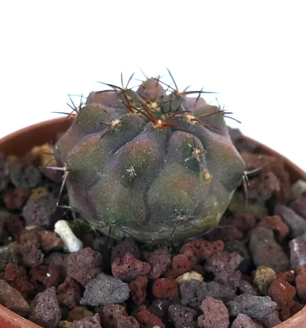 Presenta una forma robusta, sferica o leggermente allungata, con spine dense che variano dal grigio al violetto, tipiche di C. griseoviolacea. Le spine proteggono e ombreggiano riducendo la perdita d’acqua. La pelle può avere un rivestimento ceroso che riflette la luce, eredità di C. haseltoniana. Il diametro arriva fino a 15 cm.