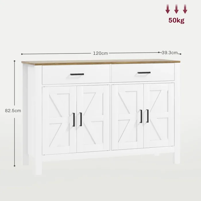 Credenza Stile Rustico con 2 Cassetti e 2 Armadietti 120×39,3×82,5 cm Bianco