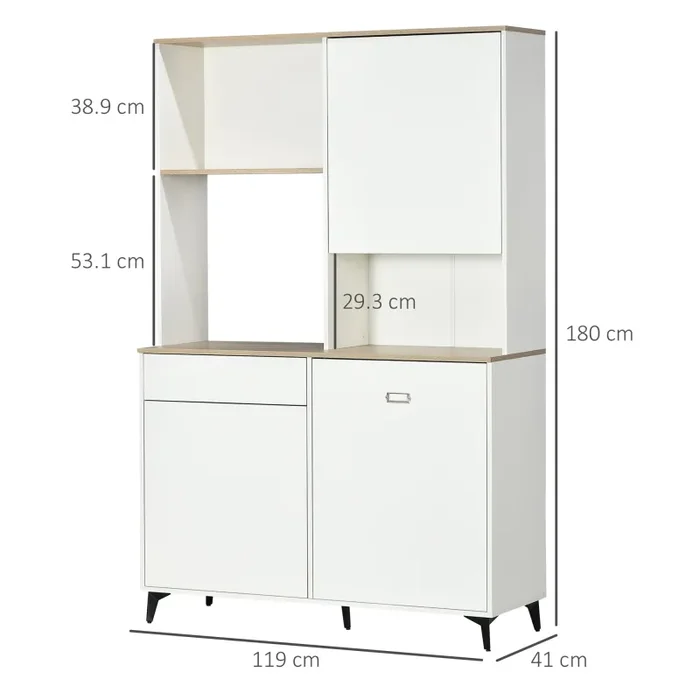 - TANTI RIPIANI A DISPOSIZIONE: I ripiani multipli del mobile dispensa offrono molto spazio per piatti, libri di cucina, pentole o contenitori, mentre il cassetto ti permette di riporre tovaglioli, asciugamani e argenteria. Lo spazio centrale aperto e il ripiano possono contenere elettrodomestici come microonde e macchinette per il caffè. Il ripiano regolabile può inoltre essere personalizzato per adattarsi a brocche, contenitori per la pasta e frullatori particolarmente alti