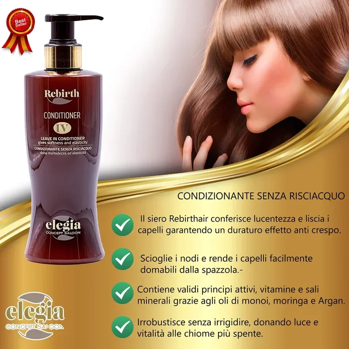 - ✅ CONDIZIONANTE SENZA RISCIACQUO 250 ml : Grazie agli Oli di Moringa, Argan, Monoi e alle vitamine e i sali minerali, Il siero Rebirthair conferisce lucentezza e liscia i capelli garantendo un duraturo effetto anti crespo, rendendoli facilmente domabili alla spazzola. Gli oli, i sali minerali e le vitamine svolgono un’azione nutriente sul capello, tale da irrobustirlo senza irrigidirlo, donando luce e vitalità alle chiome più spente. Consente l’asportazione delle impurità senza aggredire.