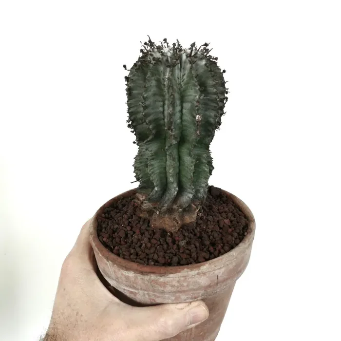 Euphorbia horrida cv. SNOW LEOPARD è un’accattivante cultivar succulenta nota per il suo aspetto sorprendente. Questa euforbia presenta fusti eretti e colonnari, ornati da tubercoli prominenti e appuntiti. L’epidermide mostra un affascinante motivo verde-argenteo con bande bianche orizzontali, che ricorda il mantello del suo omonimo, il leopardo delle nevi. Come altre specie di Euphorbia, produce fiori piccoli e poco appariscenti e una linfa lattiginosa che può essere irritante per la pelle.