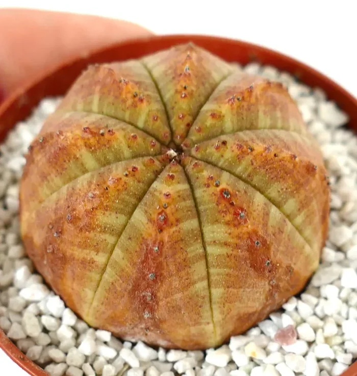 La Euphorbia obesa, nota anche come “pianta a palla da baseball”, è una succulenta sferica con una forma geometrica distintiva. Il suo corpo liscio e arrotondato è diviso in varie costole verticali, spesso con tonalità di verde o grigio, a volte accentuate da sfumature rosse o viola. Questa pianta simile a un cactus, pur essendo senza spine, ha una texture solida e un delicato motivo sulla superficie. Con il tempo, può produrre piccoli fiori gialli o verdastri sulla sommità.