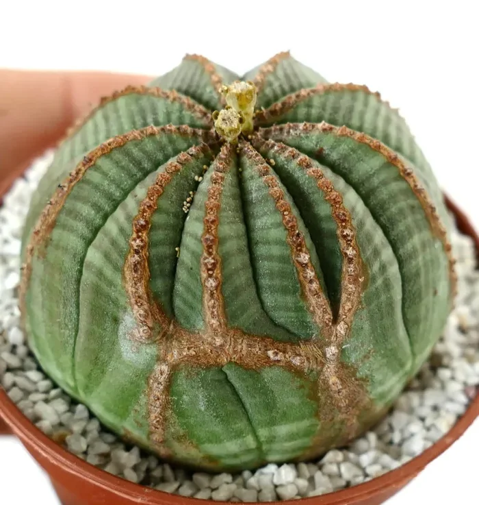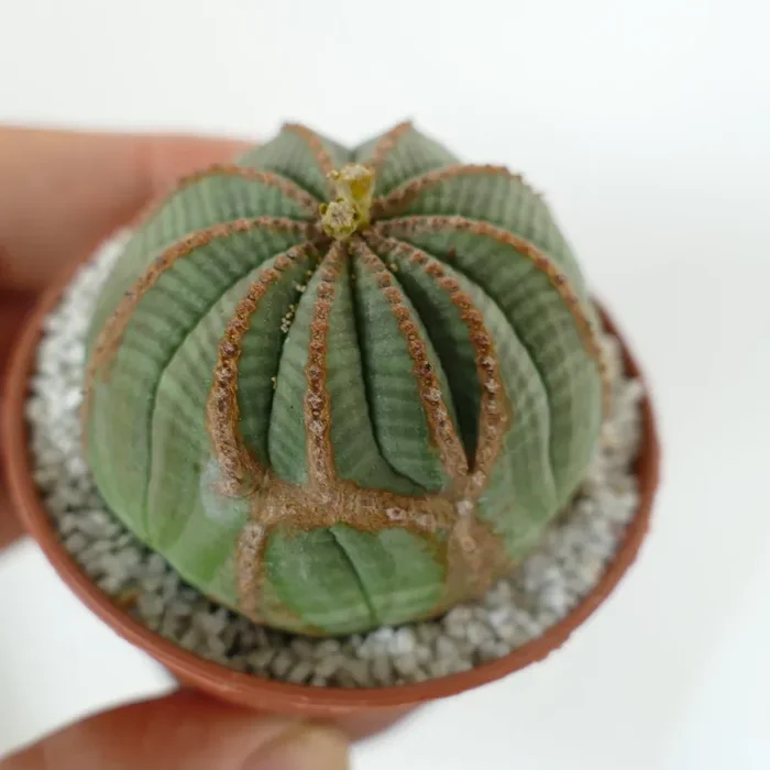 La Euphorbia obesa, nota anche come “pianta a palla da baseball”, è una succulenta sferica con una forma geometrica distintiva. Il suo corpo liscio e arrotondato è diviso in varie costole verticali, spesso con tonalità di verde o grigio, a volte accentuate da sfumature rosse o viola. Questa pianta simile a un cactus, pur essendo senza spine, ha una texture solida e un delicato motivo sulla superficie. Con il tempo, può produrre piccoli fiori gialli o verdastri sulla sommità.