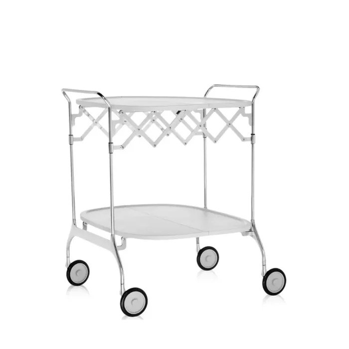 Gastone è un elegante e pratico carrello pieghevole, con piano in materiale plastico verniciato e struttura in acciaio cromato. Le ruote costituiscono un elemento formale caratterizzante e assicurano una funzionale mobilità. Una volta chiuso, ha una profondità di 23 cm e può essere riposto comodamente e facilmente.