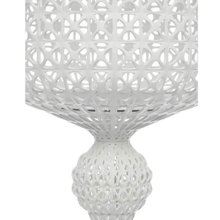 La lampada a piantana Kabuki è realizzata ad iniezione che consente di avere una struttura a trama che riproduce il pizzo con una particolare superficie traforata da cui si diffonde la luce. Diponibile nelle versioni indoor e outdoor.