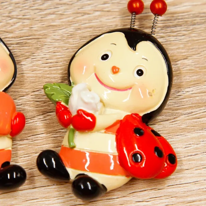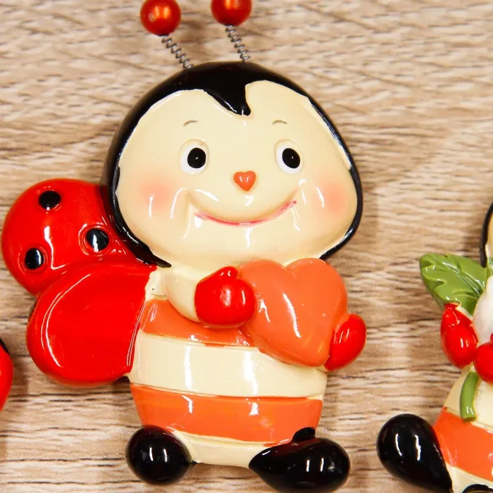 Calamita Coccinella in Tre modelli Assortiti. Ogni soggetto ha tra le zampe un oggetto diverso: un Cuoricino, una Margherita ed una Rosa.