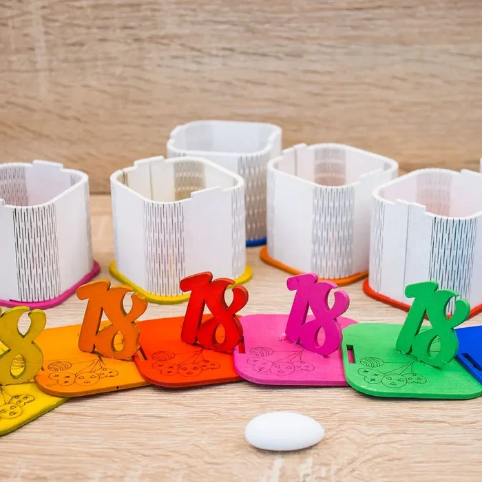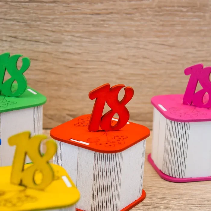 Portaconfetti quadrato con palloncini e numero 18 rialzato.