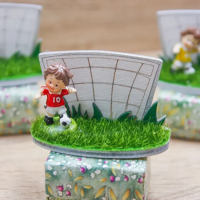 Portaconfetti con Calciatore in resina su prato e porta in legno.