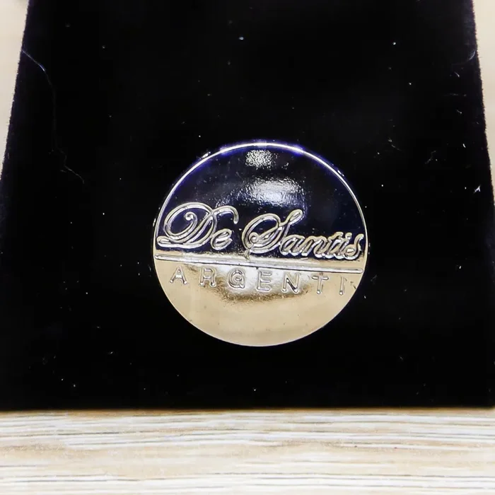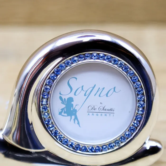 Portafoto a forma di lumaca smaltata argento e applicazioni di strass azzurri, firmato De Santis Argenti.