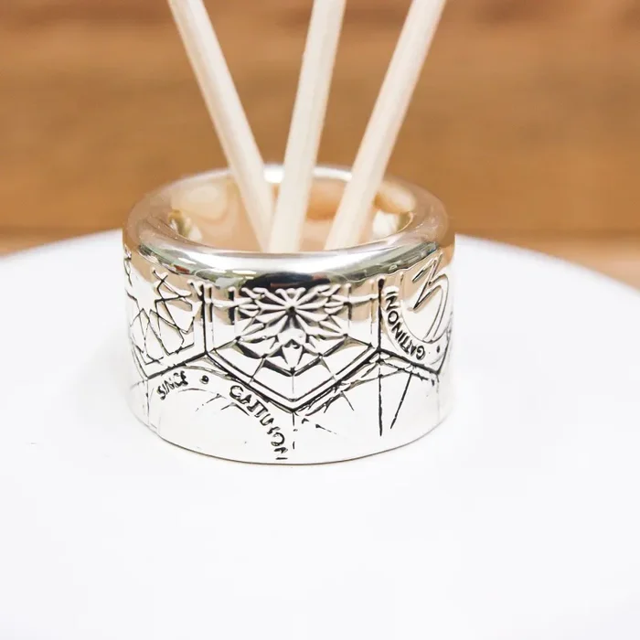 Profumatore basso dalla forma tonda, tappo color argento con decori incisi, firmato Gattinoni.