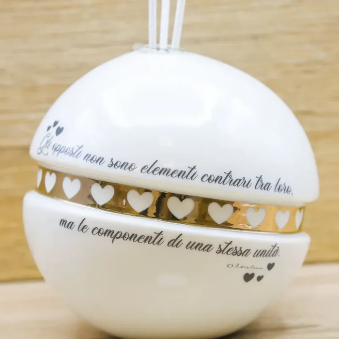 Profumatore a forma di mappamondo con una fascia color oro rosa con cuoricini traforati e frase “Gli opposti non sono elementi contrari tra loro, ma le componenti di una stessa unità”, firmato Claraluna.