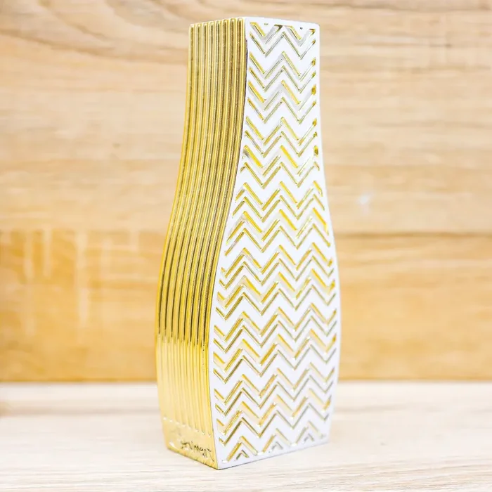 Vaso con decori geometrici bianchi e oro, firmato Lully Argenti.