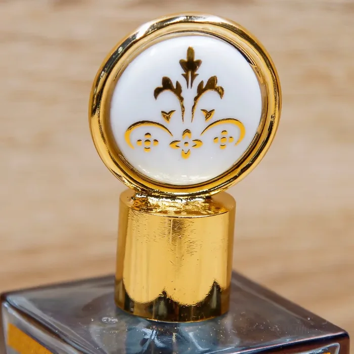 Bottiglia Piccola in Vetro con Decori Floreali in Oro, Nero e Blu. Tappo in Porcellana e Metallo in Bagno Oro 24kt , firmato Caroline