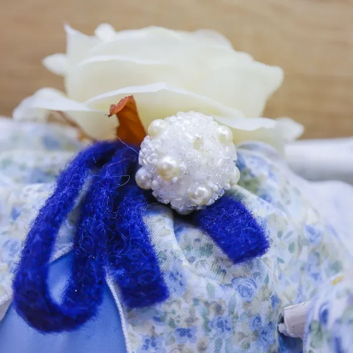 Sacchettone azzurro in raso con Sali profumati, applicazione di lana cotta, cotone decorato con fiorellini, sfera con perle e fiore grande panna , firmato Beccalli for Life.