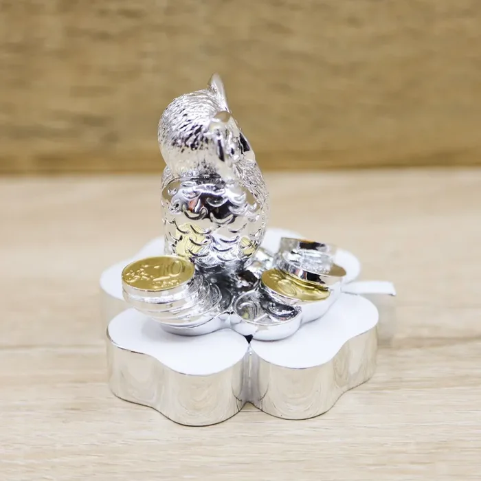 Portafortuna Quadrifoglio con Gufetto Bilaminato Argento e Monete, firmato Giovinarte.