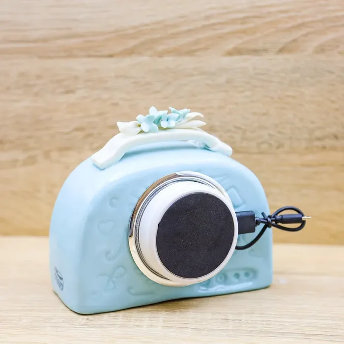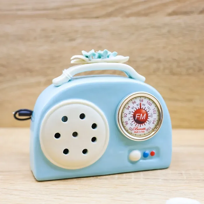 Cassa Bluetooth a forma di Radio Vintage di colore azzurro e con rifiniture laminate oro. Il manico della radio è impreziosito con fiori in porcellana ed il retro è decorato con cuori e note musicali.