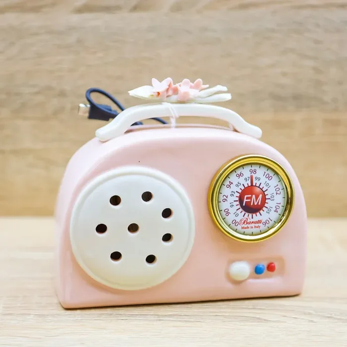 Cassa Bluetooth a forma di Radio Vintage di colore rosa e con rifiniture laminate oro. Il manico della radio è impreziosito con fiori in porcellana ed il retro è decorato con cuori e note musicali.