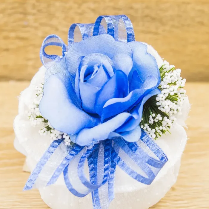 Sacchettino tondo Bianco a Pois con nastro in organza bu. Fiore Blu e nebbiolina bianca.