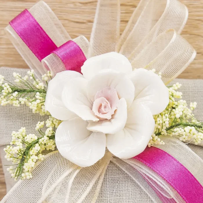Sacchetto a forma di Bustina Piccola, nastro raso fucsia, organza panna, fiorellini panna, Fiore panna e rosa in porcellana di Capodimonte-