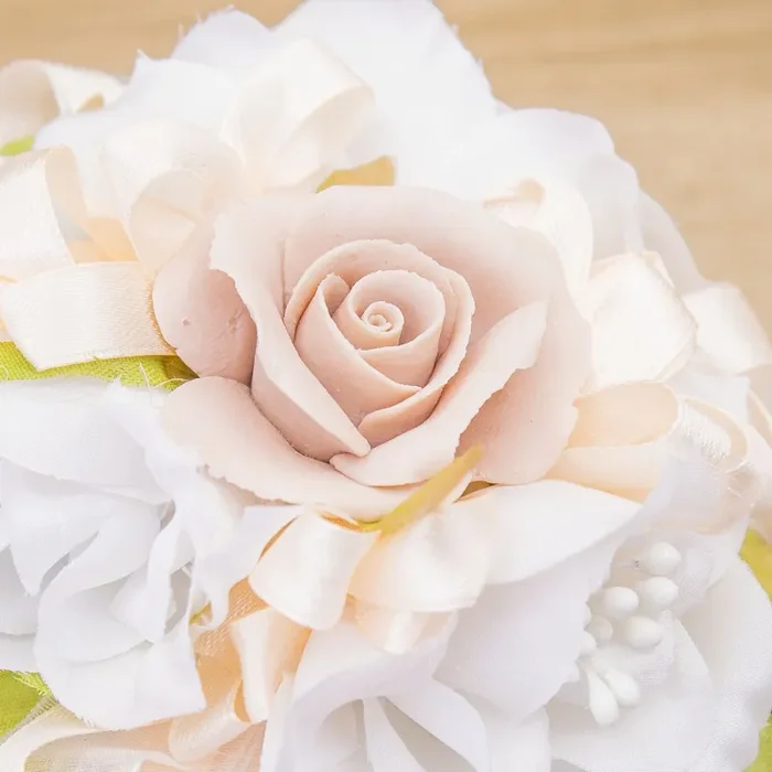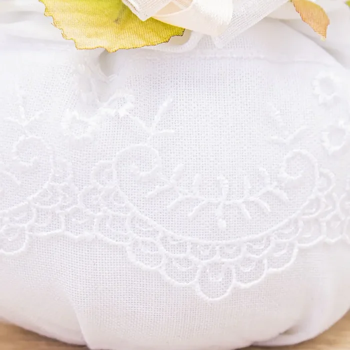 Sacchetto bianco con ricami, tre fiori bianchi, nastro raso rosa cipra e organza e rosa in porcellana di Capodimonte.