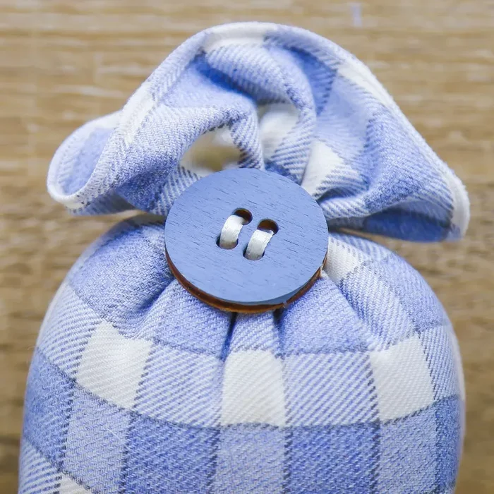Sacchetto azzurro con Sali profumati, fragranza bucaneve, decorato con quadri celesti e un bottone blu , firmato Beccalli for Life.