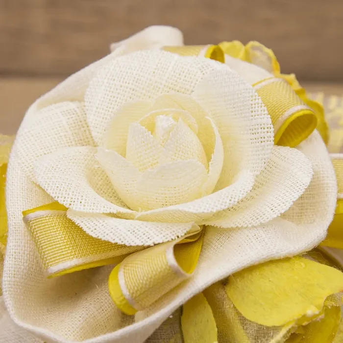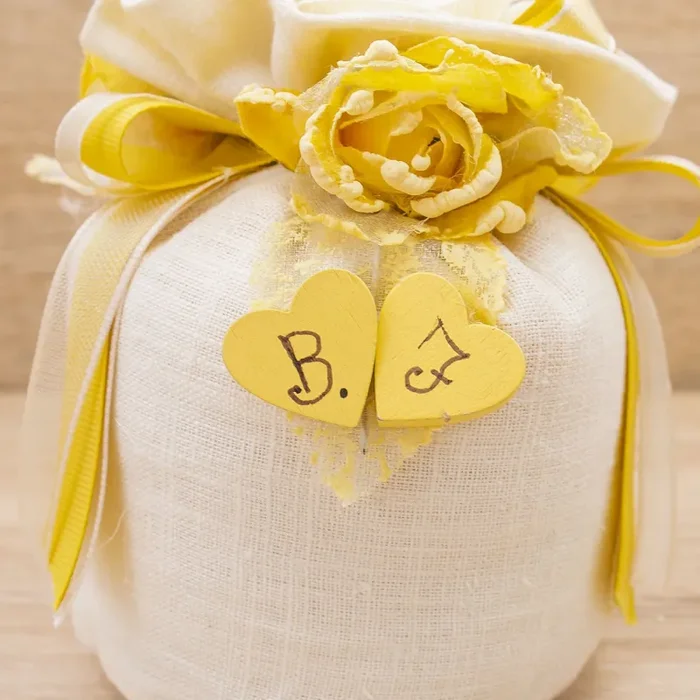 Sacchetto panna con base tonda, nastro giallo ocra, organza panna, tre rose giallo ocra con foglie, fiore panna e due cuoricini in legno con iniziali personalizzate.