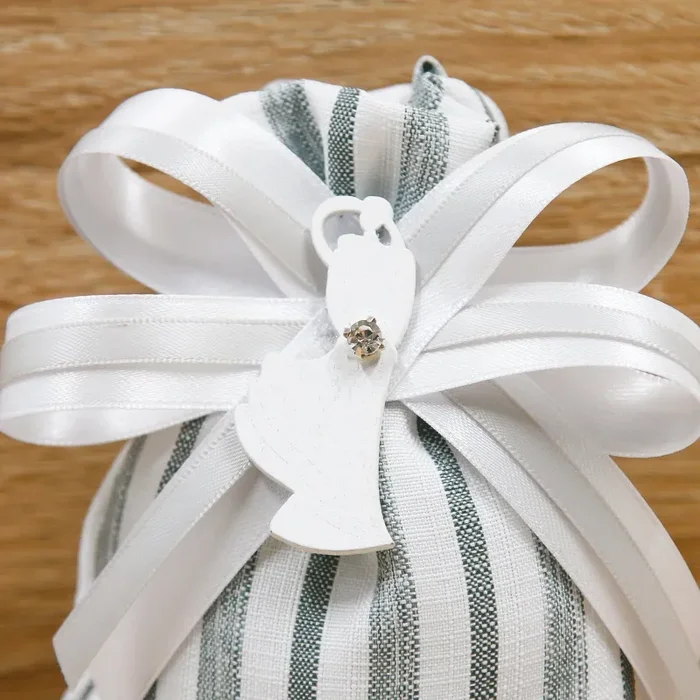 Sacchetto con linee bianche e grigie, doppio nastro e applicazione con coppia sposi e strass.
