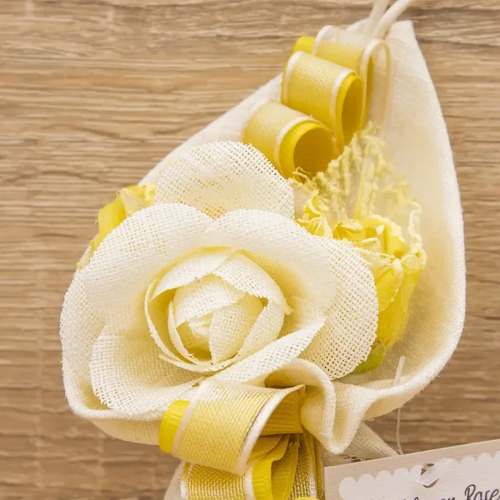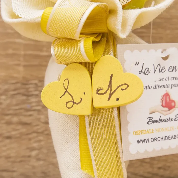 Sacchetto panna a forma di cono, nastro giallo ocra, organza panna, due rose giallo ocra con foglie, fiore panna e due cuoricini in legno con iniziali personalizzate.