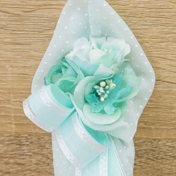 Sacchetto Cono Tiffany con Pois, nastro raso Tiffany, organza bianca e fiori Tiffany.